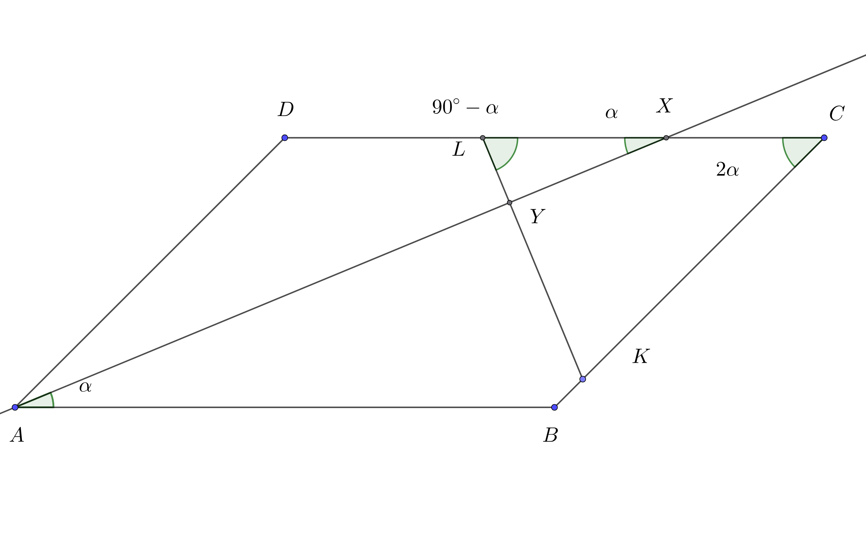 V rovnobežníku platí, že protiľahlé strany majú rovnakú dĺžku, preto $|AB|+|BC|=|AD|+|DC|$. Potom z podmienky $|AB|+|BK|=|AD|+|DL|$ ($|AB|+|BK|+|KC|=|AD|+|DL|+|LC|$) vlastne vyplýva $|KC| = |LC|$, a teda trojuholník $KLC$ je rovnoramenný. V rovnobežníku navyše platí, že osi uhlov $\sphericalangle BAD$ a $\sphericalangle LCK$ sú rovnobežné. Os v rovnoramennom trojuholníku je aj výškou na základňu, tak os uhla $\sphericalangle DCB$ je kolmá na priamku $KL$ a potom aj os $\sphericalangle BAD$ je kolmá na priamku $KL$.