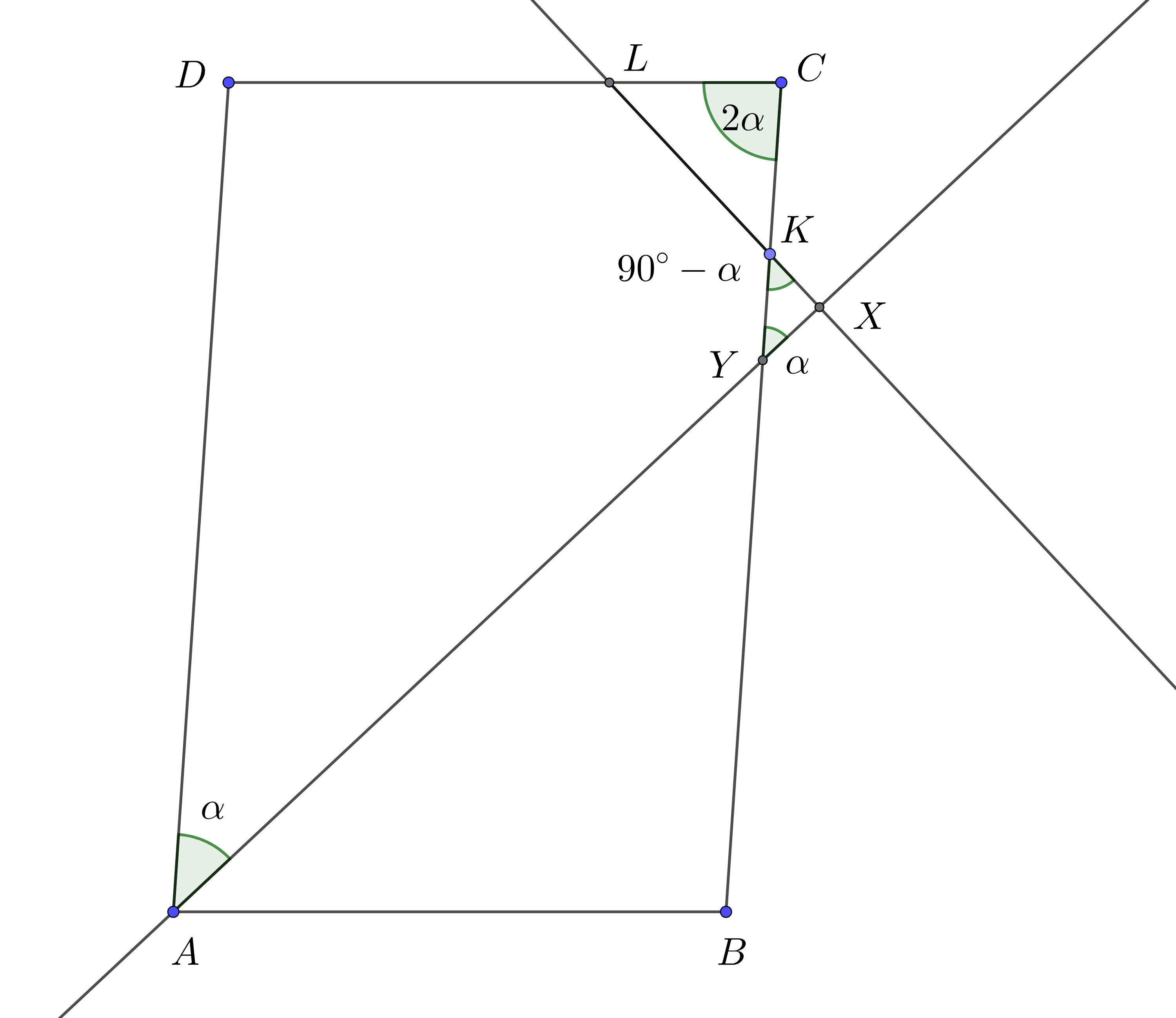 Iné riešenie: Nakreslíme si niekoľko obrázkov aby náhodou nedošlo k problému s konfiguráciami. Uvedomíme si, že trojuholník $CKL$ je rovnoramenný, a preto $|\sphericalangle KLC| = |\sphericalangle CKL| = 90^\circ - \alpha$. Potom v trojuholníku $XYL$ resp. $XYK$ je jeden uhol $90^\circ - \alpha$ buďto priamo alebo z vrcholových uhlov. Druhý uhol je $\alpha$ zo súhlasných uhlov pri rovnobežkách a posledný, hľadaný uhol, je $90^\circ$. Pri popisovaní uhlov je však potrebné si uvedomiť, na ktorú konfiguráciu sa odvolávame.