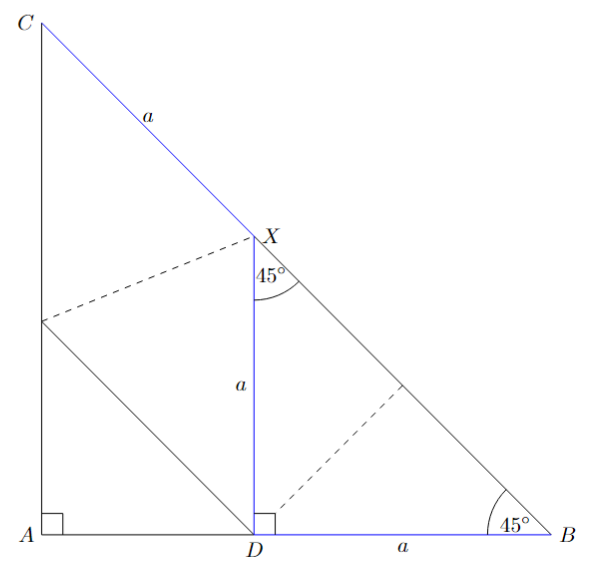 Označme si dĺžku strán $|BD|=|DX|=|XC|=a$. Trojuholník $BDX$ je rovnoramenný pravouhlý s odvesnami dĺžky $a$. Jeho prepona bude mať teda z Pytagorovej vety veľkosť $\sqrt{2} a$. Podobne z Pytagorovej vety si vieme vypočítať dĺžku uhlopriečky pôvodného štvorca. Vyjde nám, že má dĺžku $24\sqrt{2}$. Túto dĺžku teda vieme vyjadriť dvoma rôznymi spôsobmi ako $$24\sqrt{2}=|BC|=|CX|+|XB|=a+\sqrt{2}a,$$ z čoho dostaneme, že $$a=\frac{24\sqrt{2}}{1+\sqrt{2}}.$$ Z tohto vieme následne zistiť dĺžku úsečky $AD$ ako $$\begin{align}