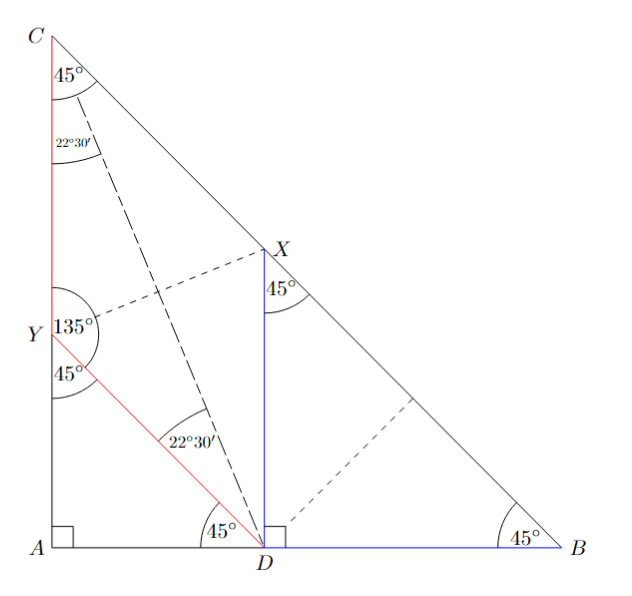 Označme si druhý bod prehybu bodu $C$ do $D$ ako $Y$. Z toho, že trojuholník $YDX$ je len prehnutý $YCX$, tak bude platiť, že $|\sphericalangle XDY|=|\sphericalangle XCY|=45^\circ$ a $|CY|=|YD|$.