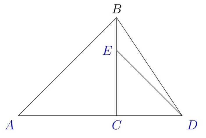 Doktor Kóši pozrel na svoj skalpel a zarezal ním do Trojuholníka $ADB$. Trojuholník $ADB$ mal tuhý korienok. Jeho strana $AD$ bola dlhá $12$ cm. Avšak ani to trojuholníku nepomohlo. Kóši ním viedol dva rezy ako na obrázku, čím ho rozdelil na trojicu Trojuholníkov. Trojuholníky $ACB$ a $ECD$ boli pravouhlé, rovnoramenné a obsah Trojuholníka $EDB$ bol $9 \text{ cm}^2$. Aký bol obsah trojuholníka $ABD$?