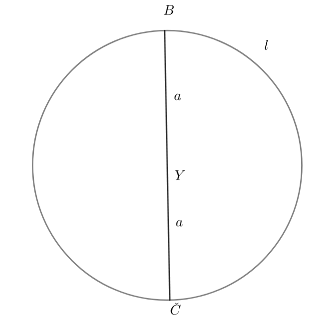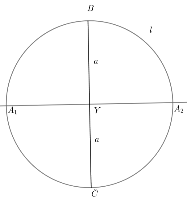 Na úplnom začiatku je dobré si predstaviť, ako bude situácia vyzerať na obrázku. Pokiaľ má bod $Y$ ležať na úsečke $B\check{C}$, a zároveň body $B, \check{C}$ ležia na kružnici $l$, ktorej je bod $Y$ stredom, potom musí platiť, že bod $Y$ je stredom úsečky, pretože vzdialenosť $Y$ od $B$ a $Y$ od $\check{C}$ je polomer kružnice $l$ (nazvime ho $a$).