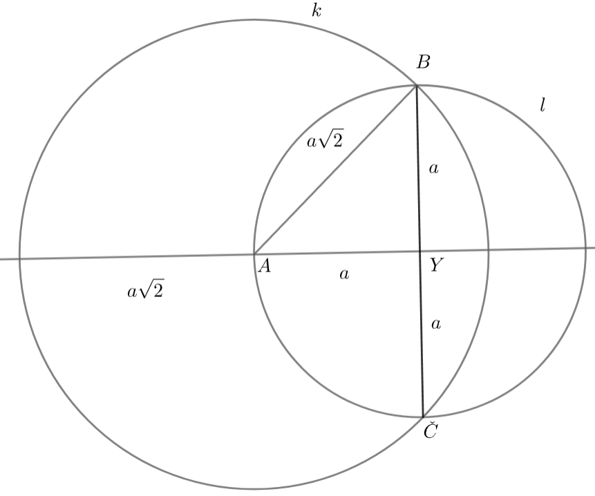 Bez ujmy na všeobecnosti uvažujme bod $A_1$ ako náš bod $A$. Vieme, že vzdialenosť bodu $A$ od bodu $Y$ je $a$, pretože bod $A$ leží na kružnici $l$. Zároveň vieme, že uhly $AYB$ a $AY\check{C}$ sú pravé, keďže bod $A$ leží na osi úsečky $B\check{C}$. Tým pádom vieme dorátať dĺžku strany $AB$ cez Pytagorovu vetu ako $$\begin{align} |AY|^2 + |BY|^2 &= |AB|^2, \ \sqrt{a^2+a^2} &= a\sqrt{2}.\end{align}$$