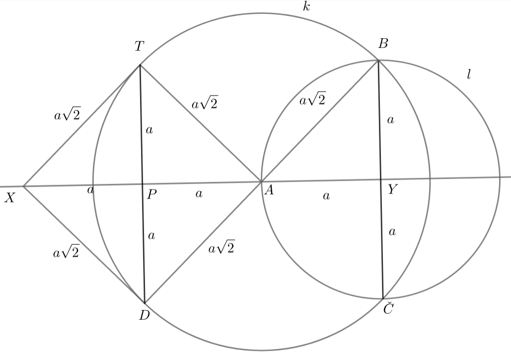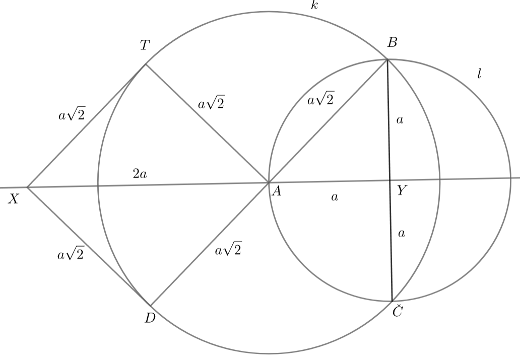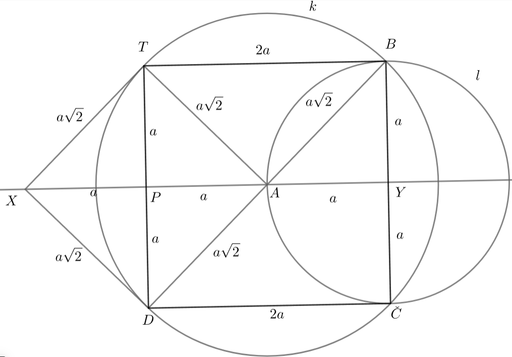 Teraz zostrojme dotyčnicu ku kružnici $k$ z bodu $X$ cez dotykový bod $T$. Zároveň veďme k tomuto bodu úsečku z bodu A. Keďže bod $T$ leží na kružnici $k$, tak jeho vzdialenosť od bodu $A$ je polomer kružnice $k$, teda $a\sqrt{2}$. Navyše vieme, že vzdialenosť bodov $X, A$ je $2a$ a v bode $T$ sa nachádza pravý uhol, pretože tam máme dotyčnicu. Z Pytagorovej vety teda opäť vieme dorátať dĺžku strany $XT$. $$\begin{align} |XT|^2 &= |XA|^2 - |AT|^2,\ |XT| &= \sqrt{(2a)^2-\left(a\sqrt{2}\right)^2} = \sqrt{4a^2-2a^2} = \sqrt{2a^2} = a\sqrt{2}.\end{align}$$