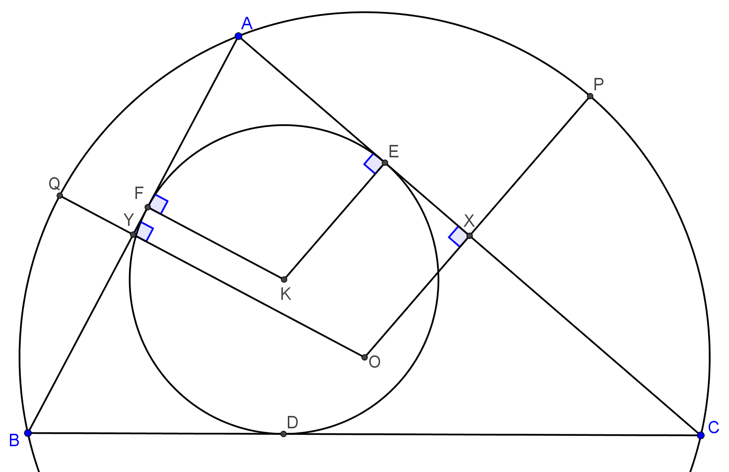 Označme $O$ stred kružnice $k$. Podľa zadania nám stačí ekvivalentne dokázať, že bod $L$ leží na priamke $KO$, resp. že priamky $KO, PE$ a $QF$ sa pretínajú v jednom bode. Ak dokážeme ľubovoľné z týchto tvrdení, tak máme vyhrané. My sa zameriame na to posledné.