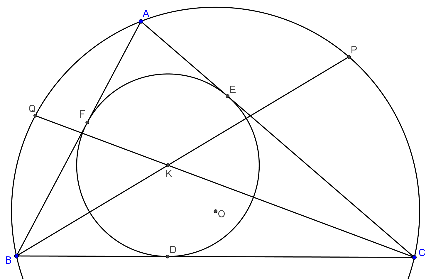 Než sa však pustíme do dokazovania, preskúmajme najprv body, ktoré dané priamky definujú. Bod $K$ je stredom vpísanej, bod $O$ stredom opísanej kružnice. V bodoch $E$ a $F$ sa vpísaná kružnica dotýka strán trojuholníka. Najzaujímavejšie sú body $P$ a $Q$. Priamka $BK$, na ktorej leží $P$, je os uhla $\sphericalangle ABC$. Je známe, že os uhla pretína kružnicu opísanú trojuholníku v strede kružnicového oblúka, v tomto prípade medzi $A$ a $C$.1 Jedná sa o tzv. Švrčkov bod trojuholníka $ABC$ voči bodu $B$. Bod $P$ teda zároveň leží aj na osi strany $AC$. Rovnako by sme dokázali, že aj bod $Q$ leží na osi strany $AB$.