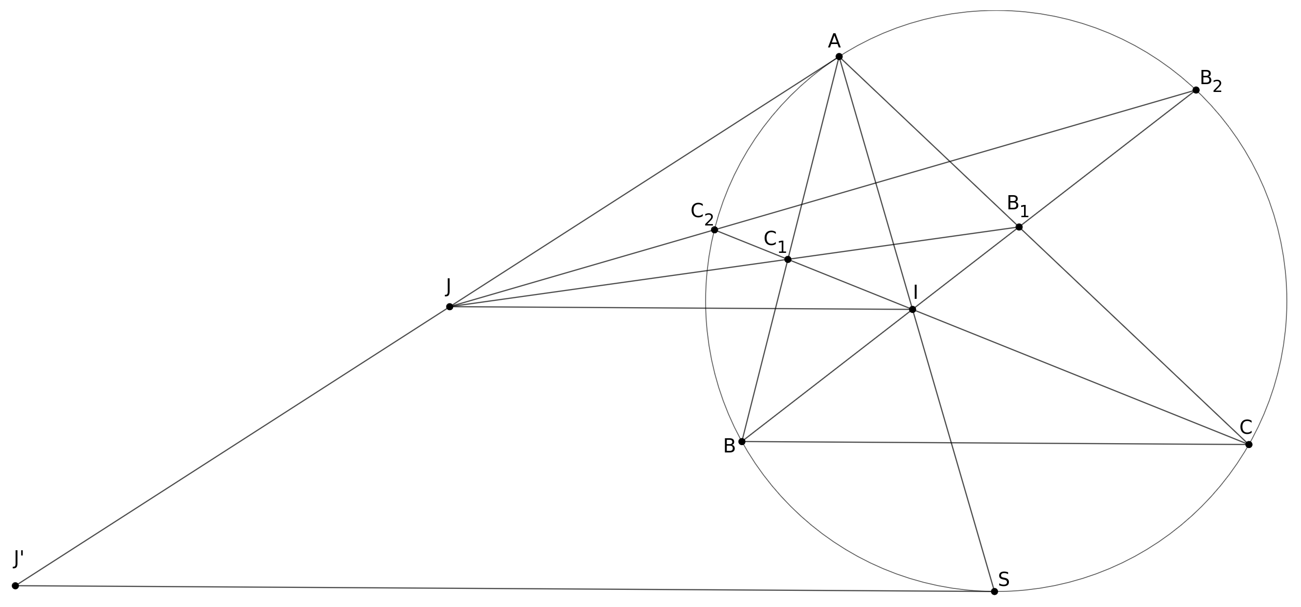 Môžeme si všimnúť, že na opísanej kružnici máme celkom dosť ($5$) bodov. Zároveň sa veľa priamok z týchto bodov pretína v známych bodoch, teda vyzerá to tak, že sa bude dať použiť Pascalova veta. A keď to ešte z obrázku vyzerá, že $JA$ sa dotýka kružnice opísanej, tak tušíme, že treba použiť Pascala na bodoch $A$, $A$, $B$, $B_2$, $C_2$, $C$. Z toho dostávame, že priesečníky $AA$ (teda dotyčnice ku kružnici opísanej v $A$) $\cap$ $B_2C_2$, $AB \cap C_2C = C_1$, $BB_2\cap CA = B_1$ ležia na priamke. Inak povedané, $B_1C_1$, $B_2C_2$ a dotyčnica z $A$ sa pretínajú v jednom bode. To je podľa zadania bod $J$. Teda $JA$ sa dotýka kružnice opísanej.