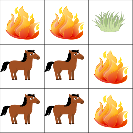 Tentoraz môže kôň spraviť prvý skok na dve políčka – $[1, 2]$ a $[2, 1]$. Zároveň si môžeme všimnúť, že pokiaľ neskáče na pašu, môže svoj riadok zmeniť jedine z $1$ na $2$ alebo z $2$ na $1$. V oboch prípadoch sa riadok mení o $1$, takže stĺpec sa zmení o $2$. Kým riadky sa musia pri každom skoku striedať, pri stĺpcoch sa môžeme rozhodnúť, či skočí smerom doprava k paši, alebo smerom doľava naspäť k počiatočnému políčku. Keďže vracať sa naspäť nijak nezmení, kam sa kôň môže dostať, po zvolení úvodného políčka je jeho cesta daná jednoznačne. Otázka znie, kedy sa dokáže dostať do cieľa.