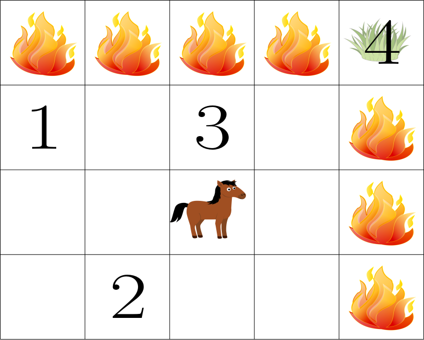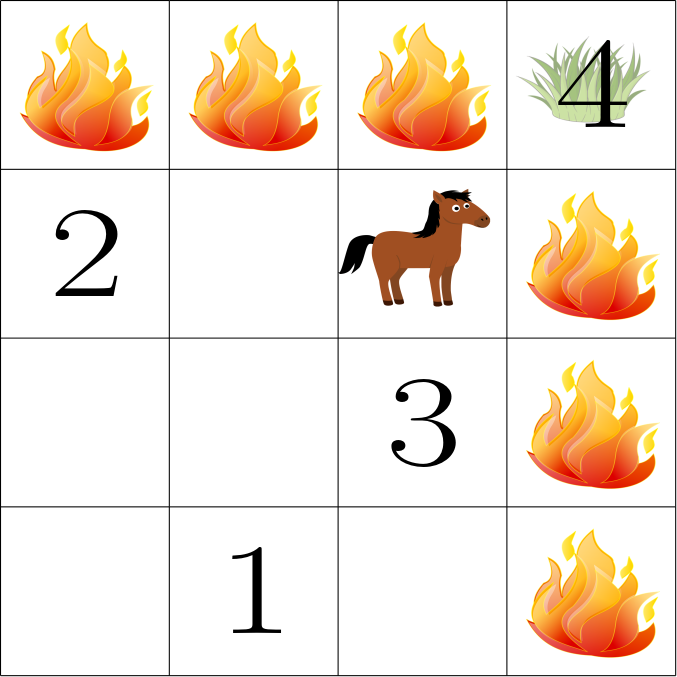 Čo však so štvrtým políčkom? Aby sa na toto políčko vôbec vedel dostať, musel tam skočiť z iného riadku/stĺpca ako sú posledné $3$. Zároveň je toto políčko príliš ďaleko od štartu, aby skočil priamo odtiaľ, takže nutne je niektoré číslo z $m, n$ viac ako $3$. Keďže sme $n$ zvolili ako „to väčšie“, tak $n \geq 4$. Potom má kôň o stĺpec viac na manévrovanie a na pašu sa dostane napríklad takto: