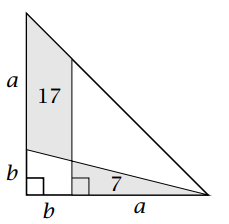 V kúte sa nachádza princeznina batožina, ktorá má tvar pravouhlého trojuholníka. Sluha princeznú zbalil do dvoch vyznačených oblastí s obsahmi $17$ a $7$. Ďalej sú na obrázku vyznačené pravé uhly a úsečky dĺžok $a$ a $b$ na rôznych častiach trojuholníkov. Nájdite súčin $a \cdot b$.
