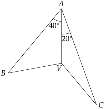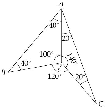 V rovnoramennom trojuholníku $ABV$ sú uhly pri základni rovnaké. Preto $|\sphericalangle VBA| = |\sphericalangle VAB| = 40^\circ$. Dopočítaním uhlov do $180^\circ$ potom dostaneme $|\sphericalangle AVB| = 100^\circ$. Rovnako pre rovnoramenný trojuholník $ACV$ dopočítame $|\sphericalangle VCA| = 20^\circ$ a $|\sphericalangle AVC| = 140^\circ$. Na záver vieme veľkosť hľadaného uhla $BVC$ zistiť odpočítaním z plného uhla: $$|\sphericalangle BVC| = 360^\circ - |\sphericalangle AVB| - |\sphericalangle AVC| = 360^\circ - 100^\circ - 140^\circ = 120^\circ.$$