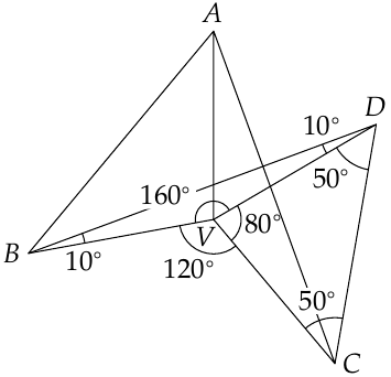 Bod $D$ zvolíme tak, aby platilo $|DV| = |BV|$, $|\sphericalangle VBD| = 10^\circ$ a aby sa úsečky $BD$ a $AV$ preťali. Vypočítajte veľkosť uhla $BDC$.