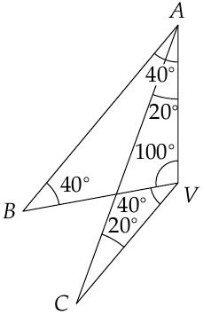 Väčšina z vás nám správne prečítala myšlienky, že sme v zadaní mysleli, že sa trojuholníky $VAB$ a $VAC$ neprekrývajú. Prísne vzaté sa však nič také v zadaní nehovorí. Preto má úloha dve riešenia – druhým je $|\sphericalangle BVC| = 40^\circ$ a $|\sphericalangle BDC| = 20^\circ.$ Oba uhly sa dajú vypočítať analogickým postupom, aký sme uviedli. Výpočet $|\sphericalangle BVC|$ naznačíme aj na obrázku.