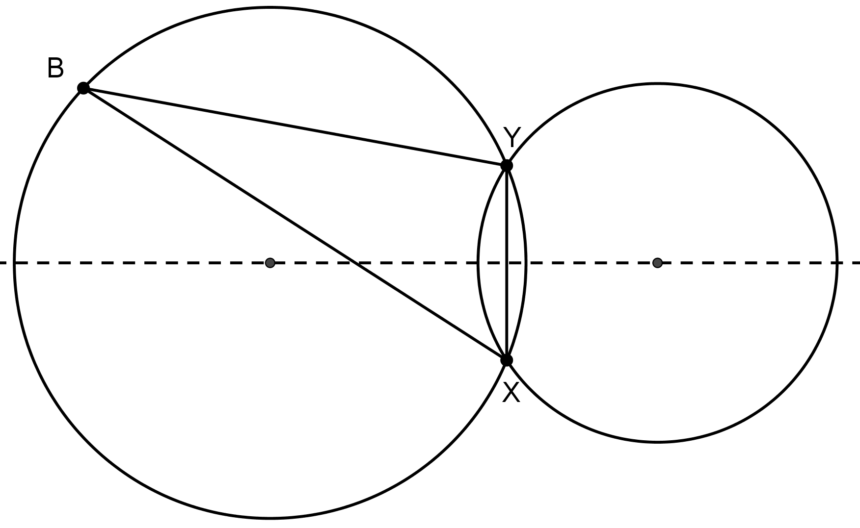 Kružnice opísané $ABX$ a $CDX$ majú spoločnú tetivu $XY$, viď obrázok. Na jej osi teda ležia stredy oboch kružníc. Táto os zároveň vyčleňuje dve polroviny – tú s bodom $Y$ budeme nazývať „nad osou“, tú s bodom $X$ „pod osou“. Aby bol uhol $\sphericalangle BYX$ tupý, musí $Y$ ležať v opačnej polrovine danej $BX$ ako stred kružnice. Inými slovami, úsečka $BX$ musí prejsť medzi bodom $Y$ a stredom kružnice, takže bod $B$ musí ležať „nad osou“.